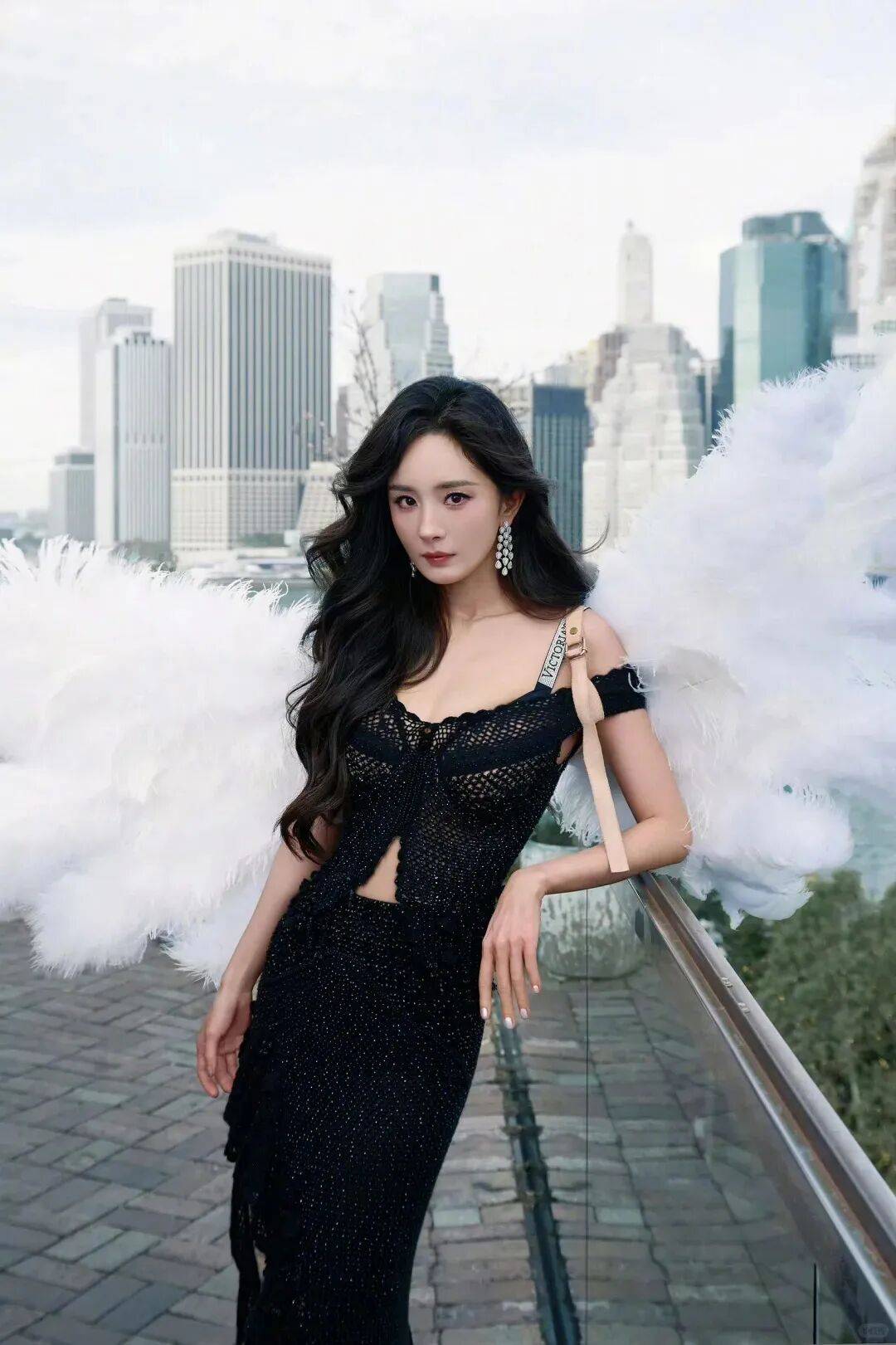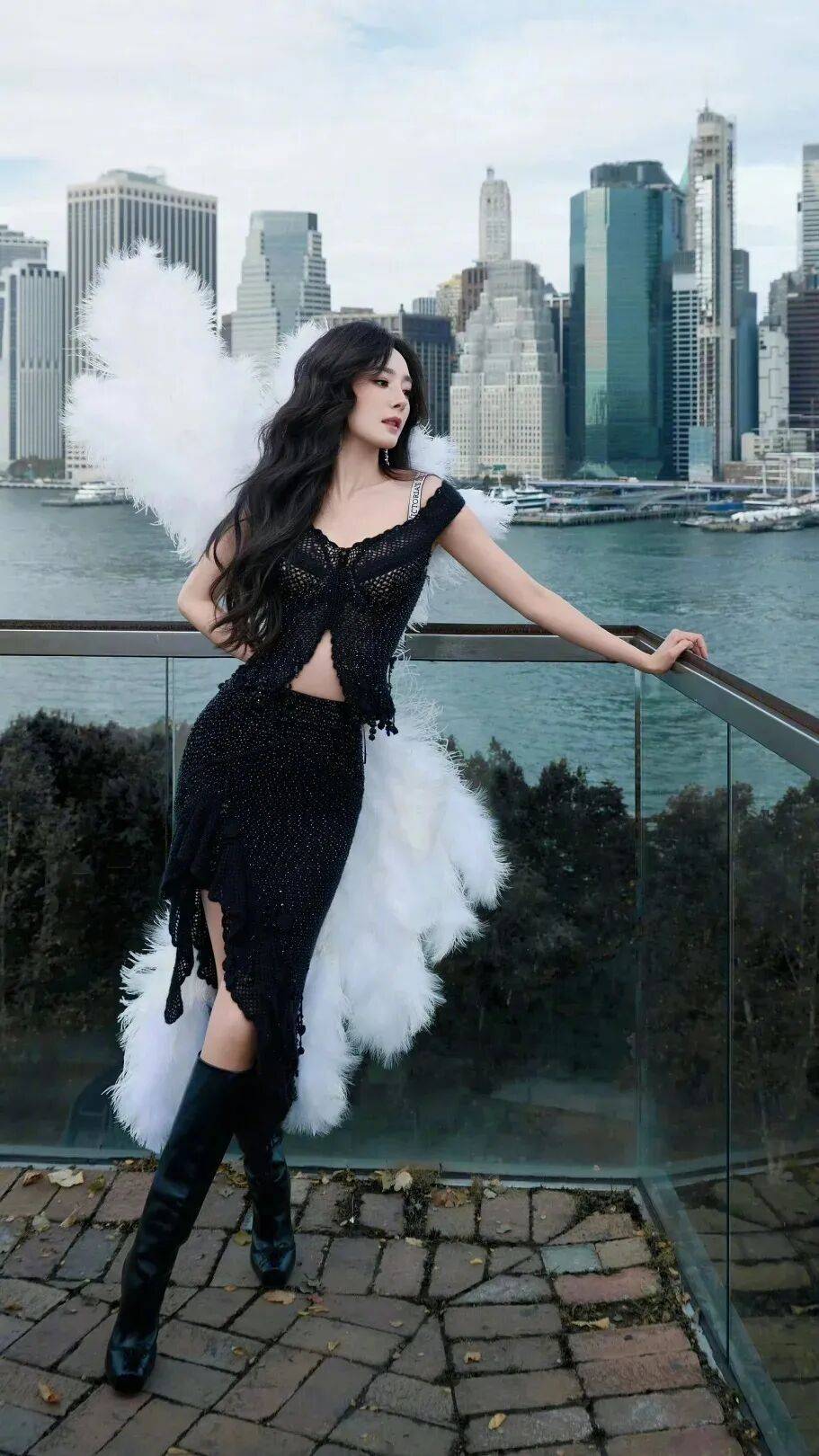 她上身Ulyana Sergeenko 2025春夏高定黑裙,秀场外搭配上维密白色羽毛翅膀,优雅与性感碰撞,适配度拉满了。