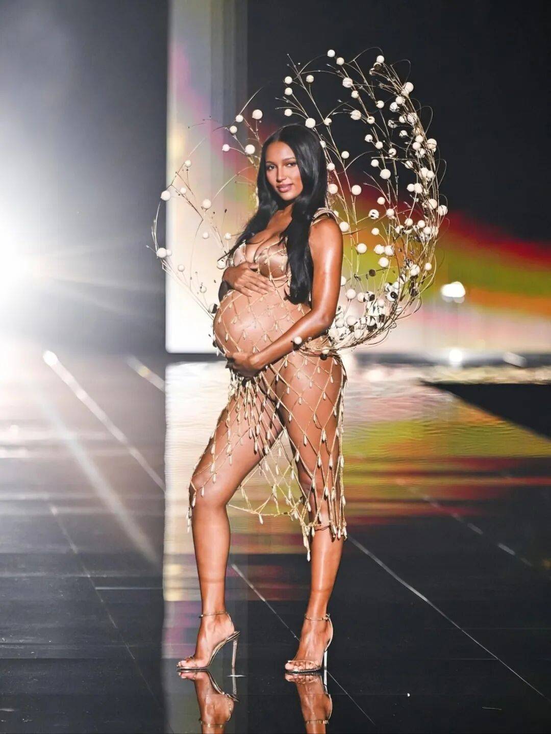 2025维密大秀可谓是惊喜不断,孕期超模Jasmine Tookes作为大开模特亮相,佩戴珍珠翅膀自信登台,散发出满满的母性光辉,这也是她第九次登上维密T台。