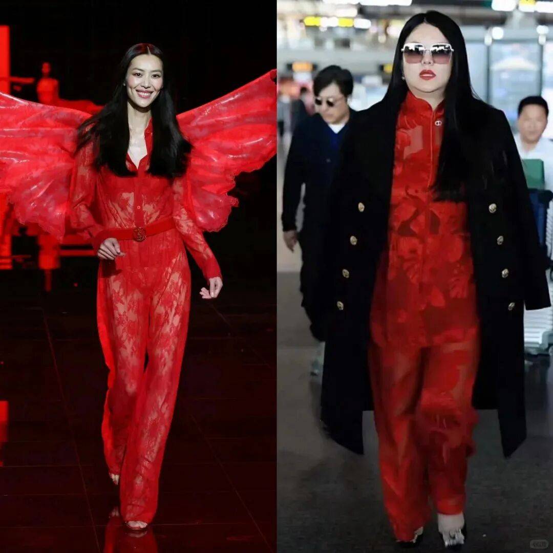 不仅如此,刘雯的这套红色“秋衣”竟然还和李湘撞了衫~